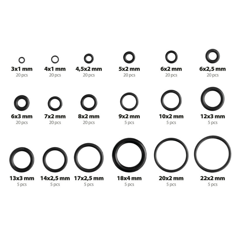 Těsnící kroužky, 225 ks, 18 velikostí Vyrobeno z NBR 20 ks: Ø 3 x 1 mm 20 ks: Ø 4 x 1 mm 20 ks: Ø 4,5 x 2 mm 20 ks: Ø 5 x 2 mm 20 ks: Ø 6 x 2 mm 20 ks: Ø 6 x ...