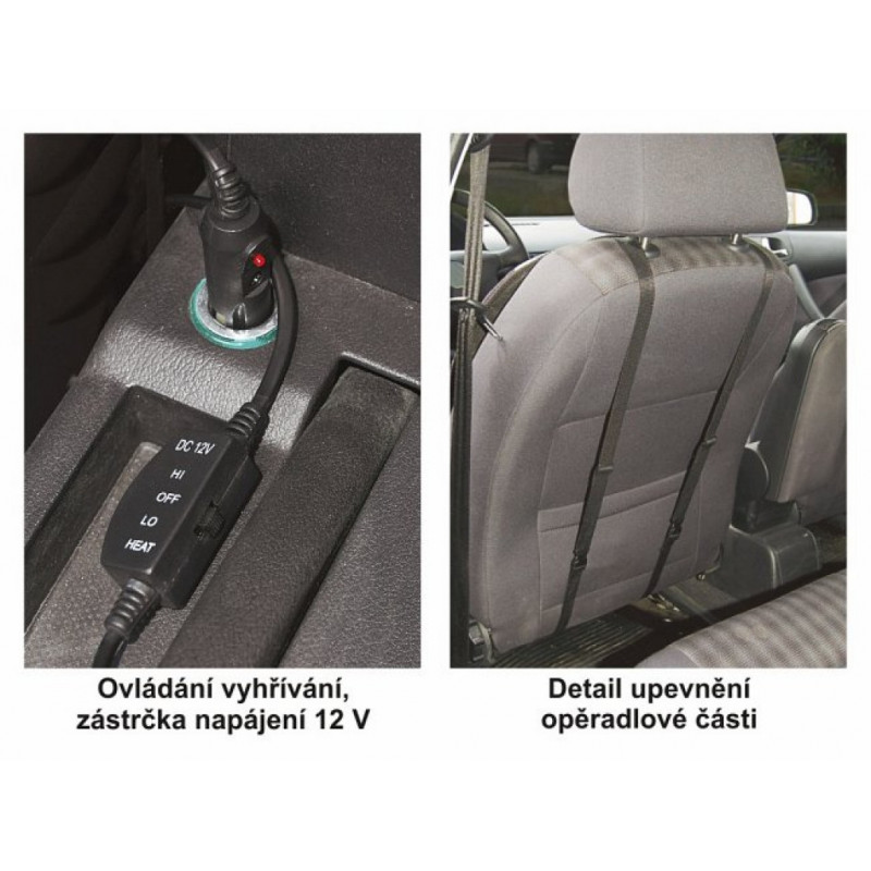 Univerzální systém upevnění, lze připevnit na většinu běžně používaných automobilových sedadel. Potah lze použít i na sedadlech, která mají zabudovaný boční airbag přímo v opěradle předních sedadel. Potah je vybaven zabudovaným termostatem a ovladačem, pomocí kterého lze volit nízký (LO) nebo vysoký (HI) režim vyhřívání potahu.