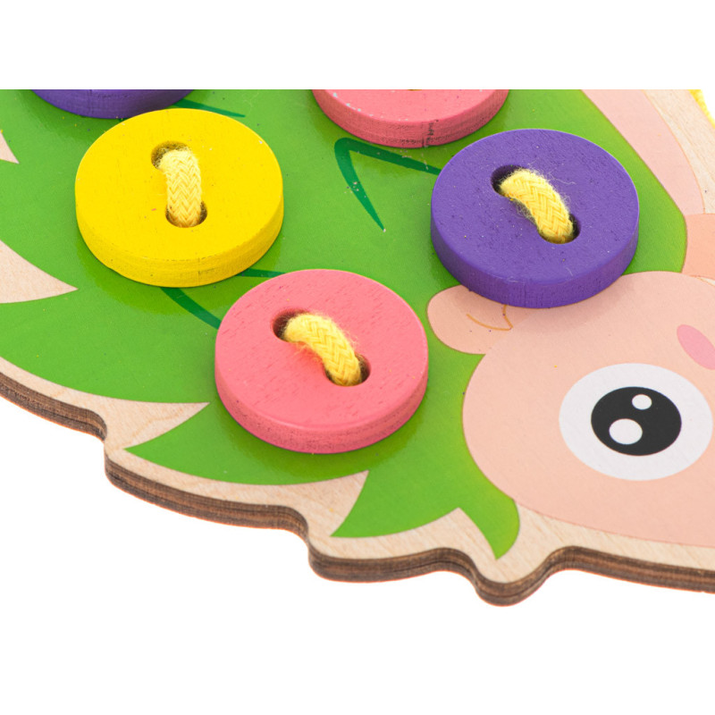 Výuková sada pro výuku šití knoflíků – Ježek je kreativní a vzdělávací hračka, která rozvíjí jemnou motoriku a logické myšlení dětí. Pomozte roztomilému ježkovi najít jeho ztracené knoflíky a připevnit je pomocí provázku – zábavná forma učení šití a provlékání.