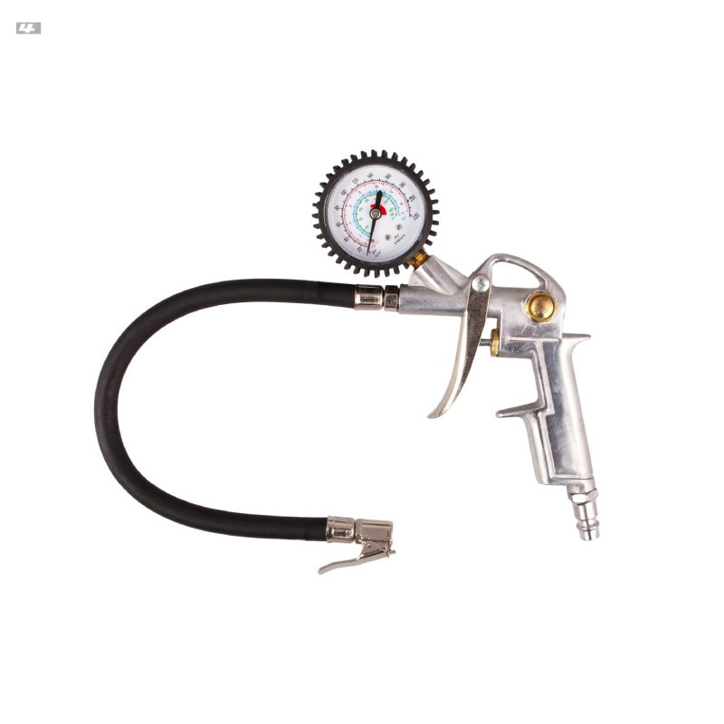 Vzduchová pistole pro dofukování pneumatik s analogovým měřičem tlaku v pneumatikách. Součástí balení je adaptér pro upevnění na ventilek pneumatiky. Dofukování je řízeno ruční spouští, po ukončení dofukování měřič zobrazí reálný tlak v pneumatice. Výpustným ventilem na rukojeti lze tlak v kole snížit.